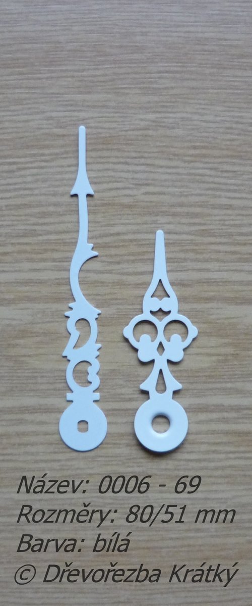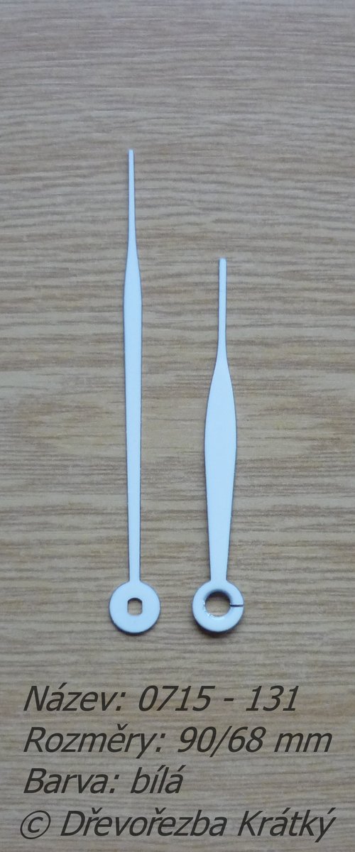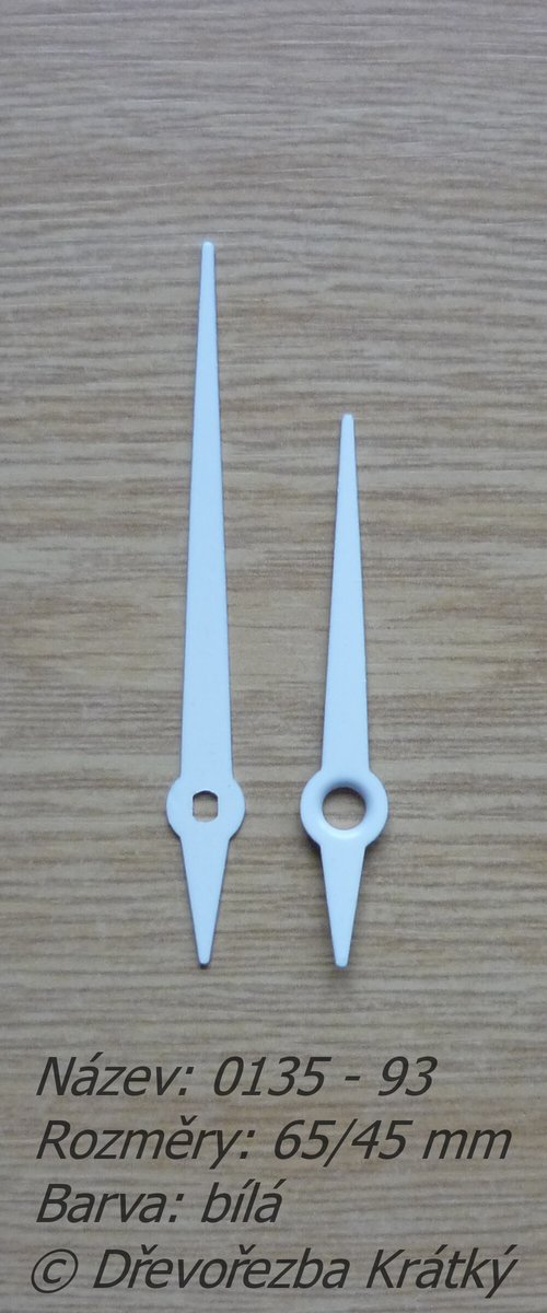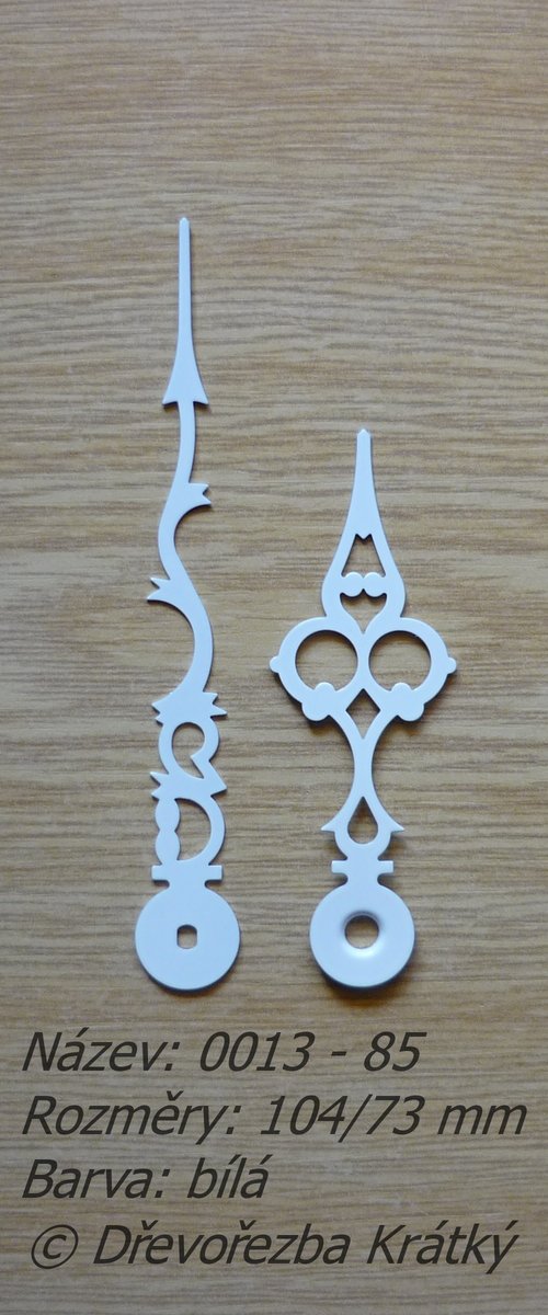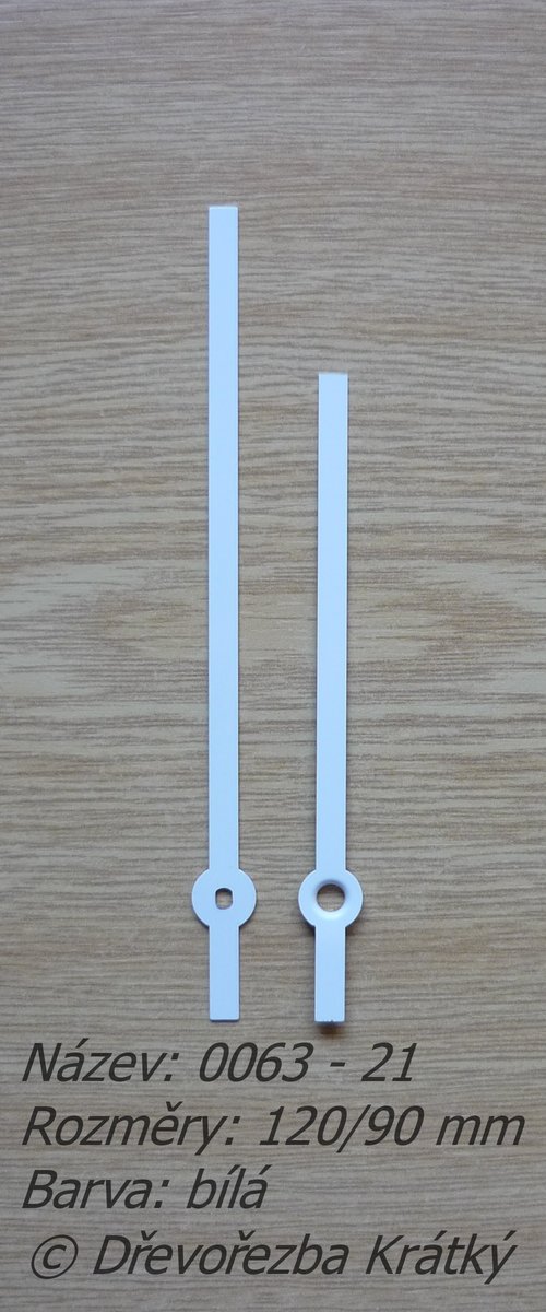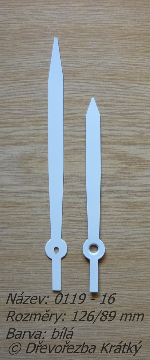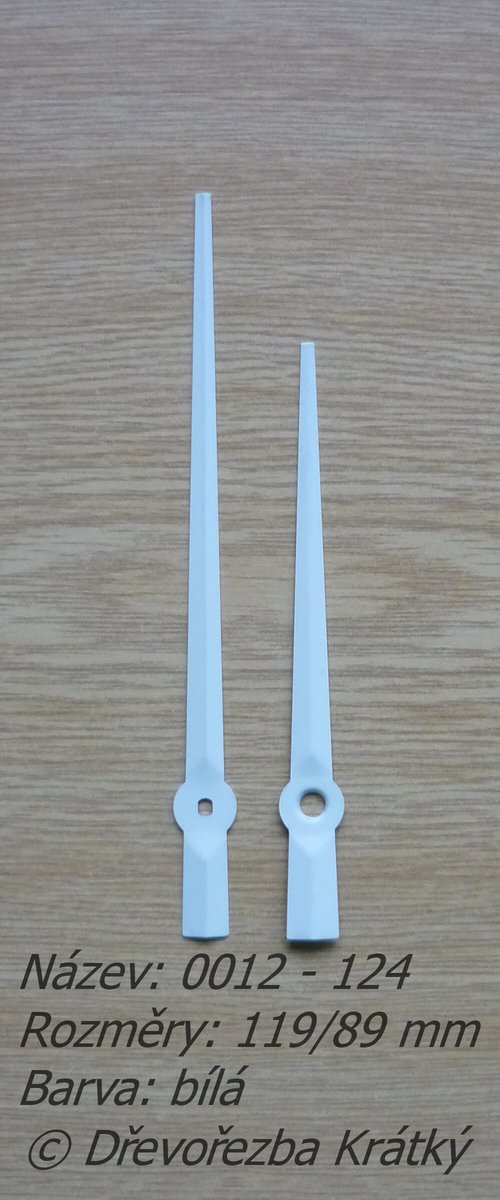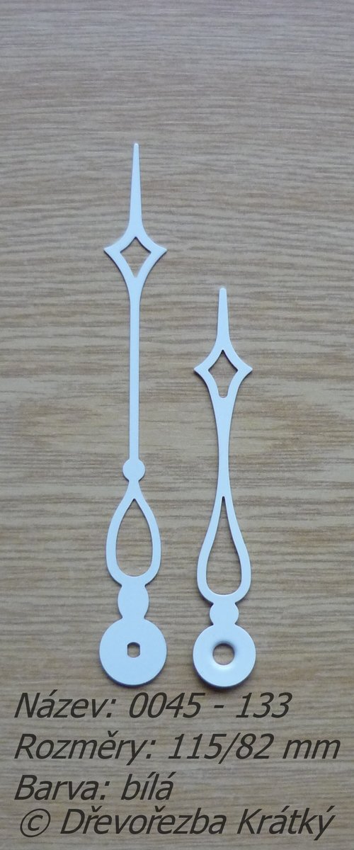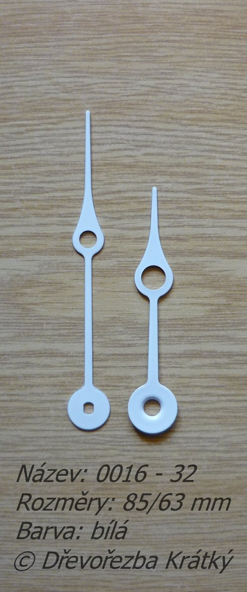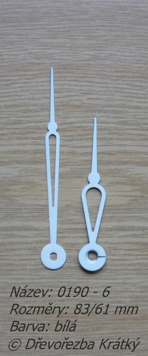 Hodinové ručičky jsou v barvách bílá, černá, zlatá. Rozměry jsou dány ve formátu "a/b", kdy "a" je délka minutové ručičky, "b" je délka hodinové ručičky, od středu otvoru až na jejich konec v milimetrech. Od velikosti ručiček se odvíjí velikost ciferníku hodin. Při objednávce uvádějte prosím název ručiček a jejich barvu.