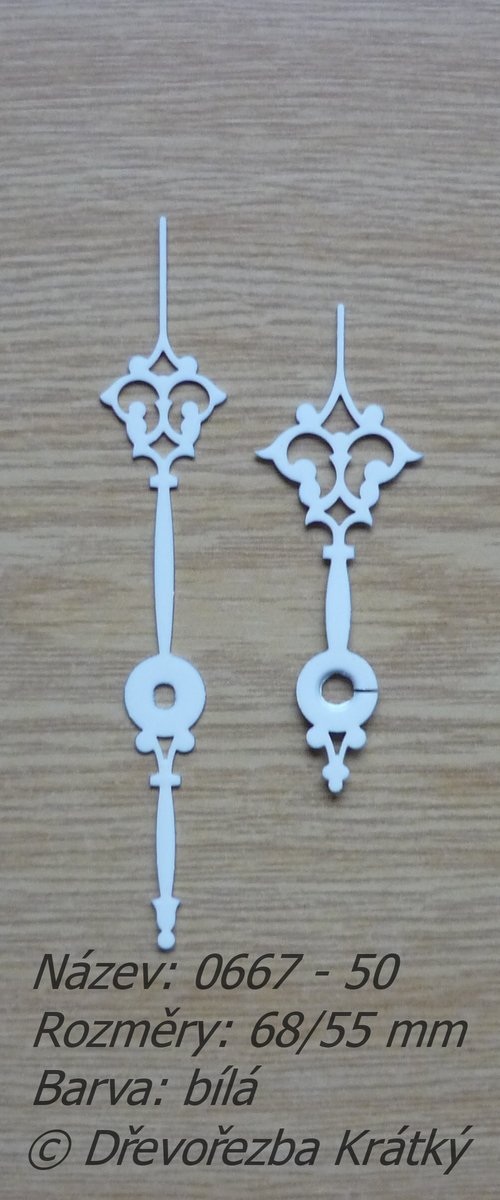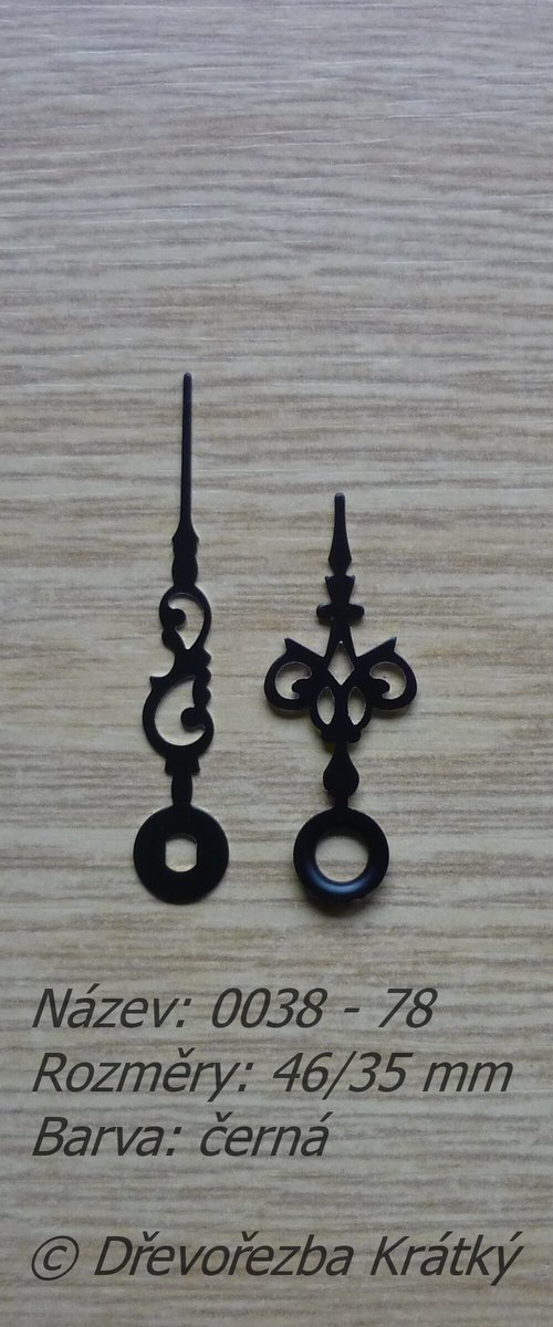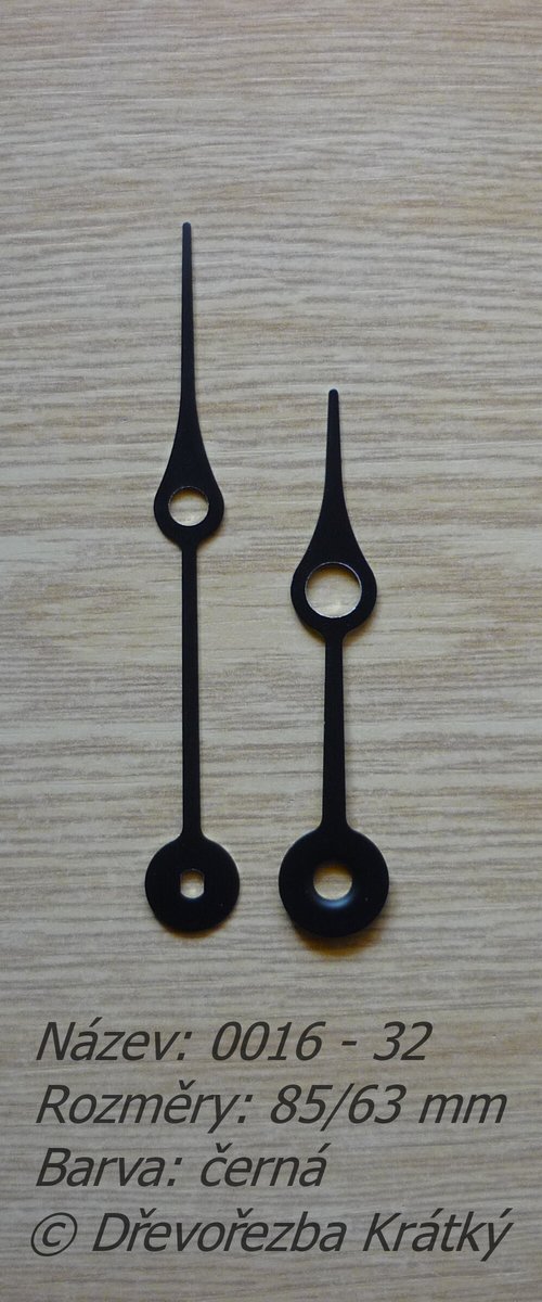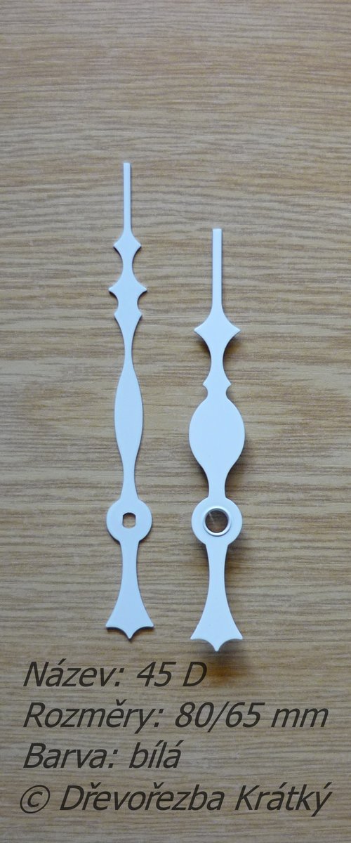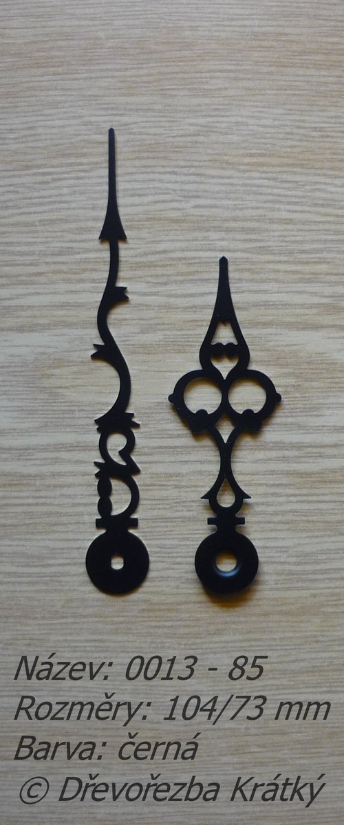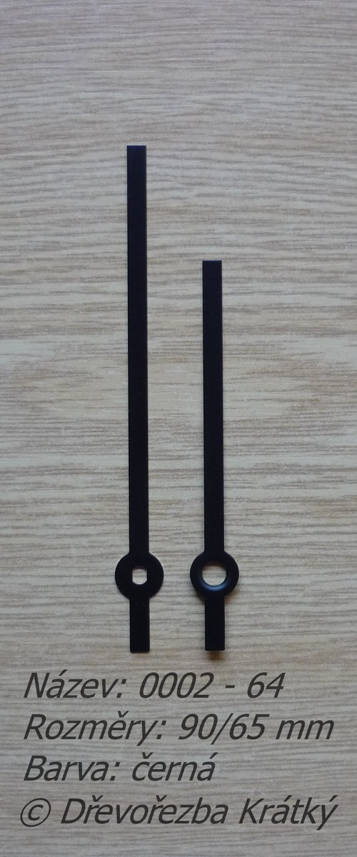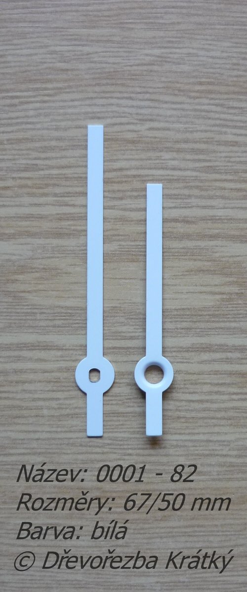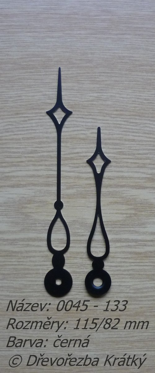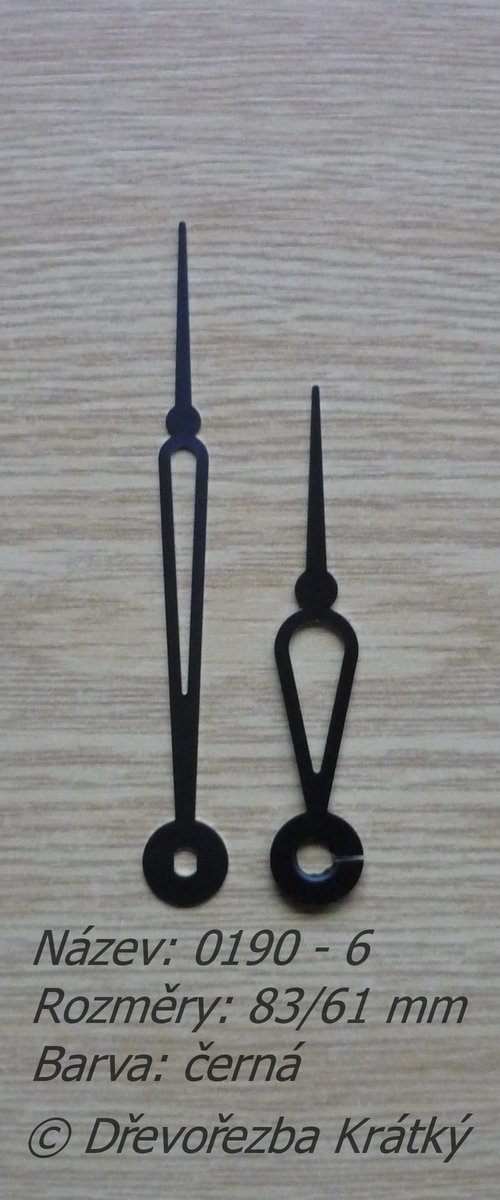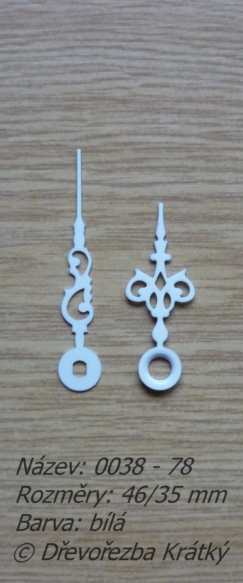 Hodinové ručičky jsou v barvách bílá, černá, zlatá. Rozměry jsou dány ve formátu "a/b", kdy "a" je délka minutové ručičky, "b" je délka hodinové ručičky, od středu otvoru až na jejich konec v milimetrech. Od velikosti ručiček se odvíjí velikost ciferníku hodin. Při objednávce uvádějte prosím název ručiček a jejich barvu.