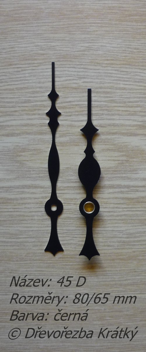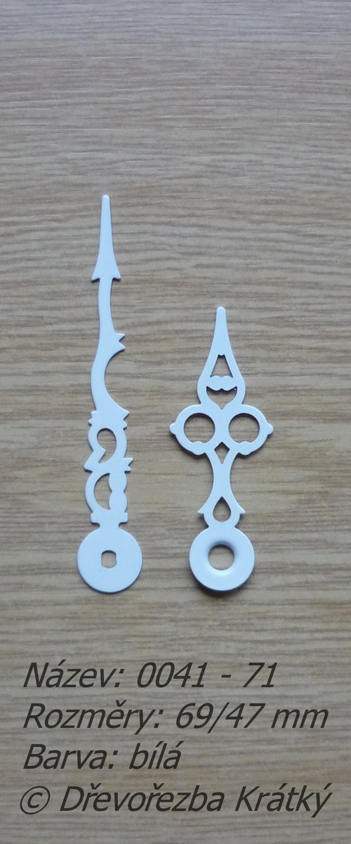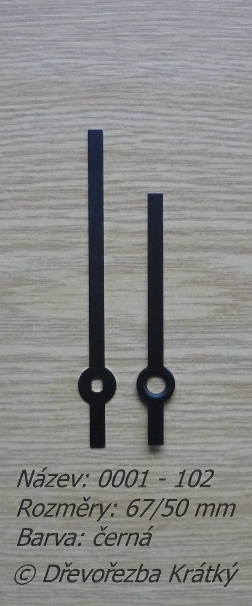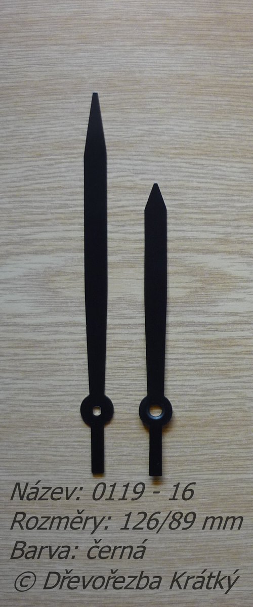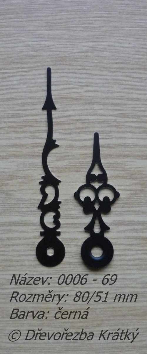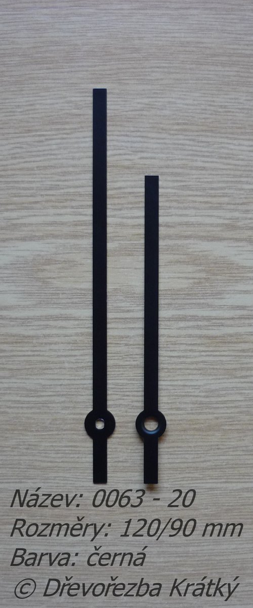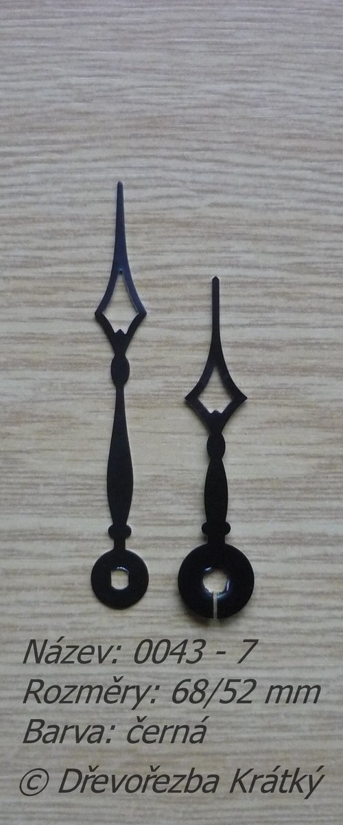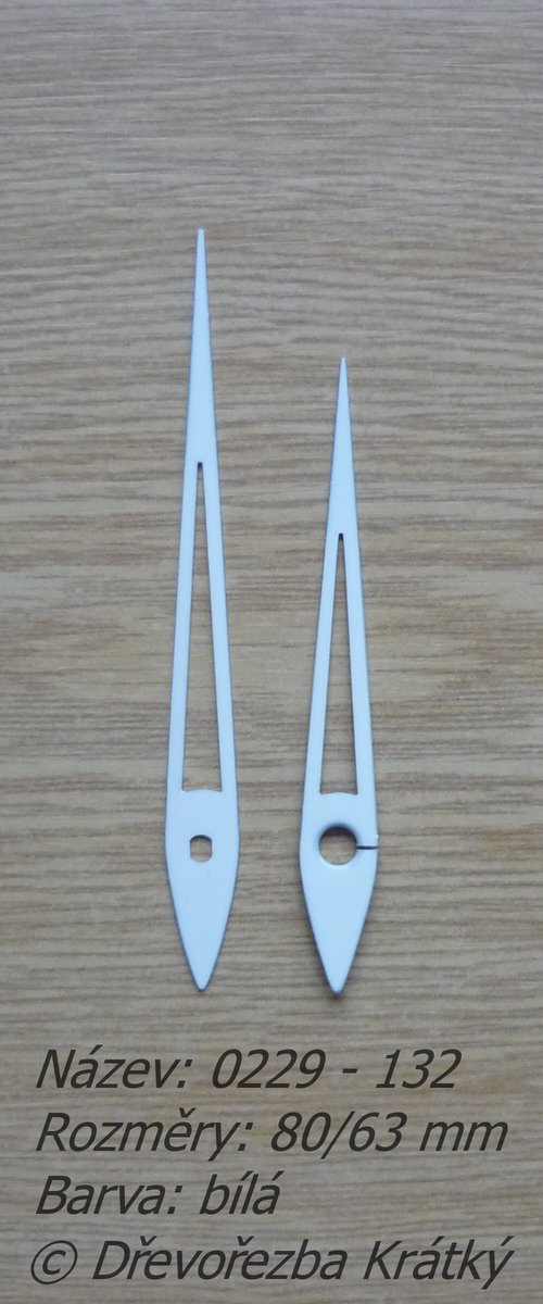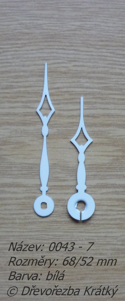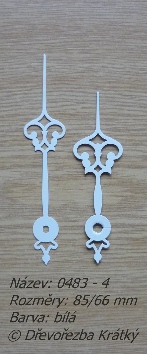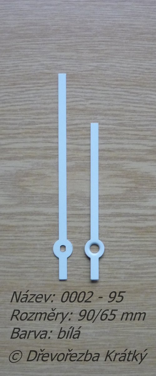 Hodinové ručičky jsou v barvách bílá, černá, zlatá. Rozměry jsou dány ve formátu "a/b", kdy "a" je délka minutové ručičky, "b" je délka hodinové ručičky, od středu otvoru až na jejich konec v milimetrech. Od velikosti ručiček se odvíjí velikost ciferníku hodin. Při objednávce uvádějte prosím název ručiček a jejich barvu.