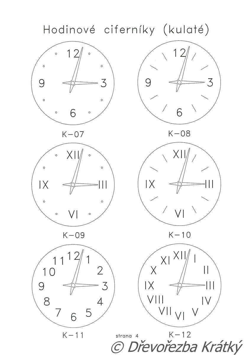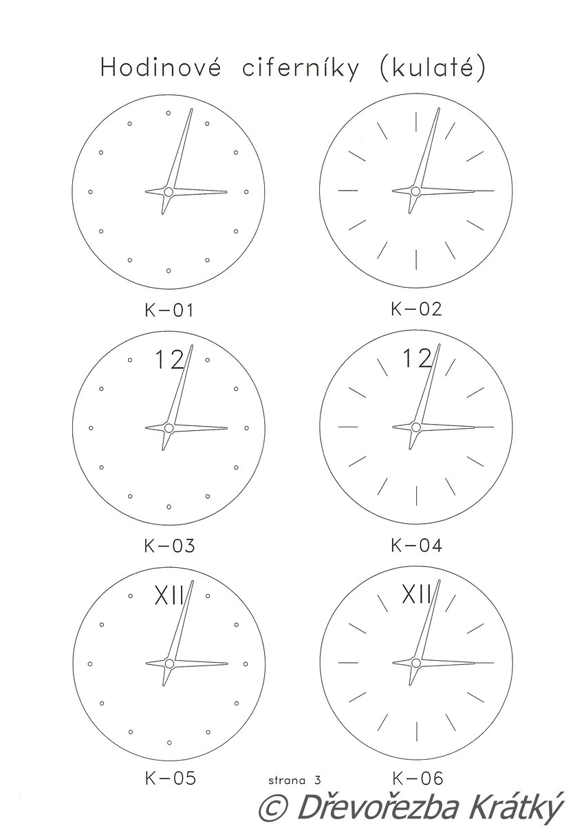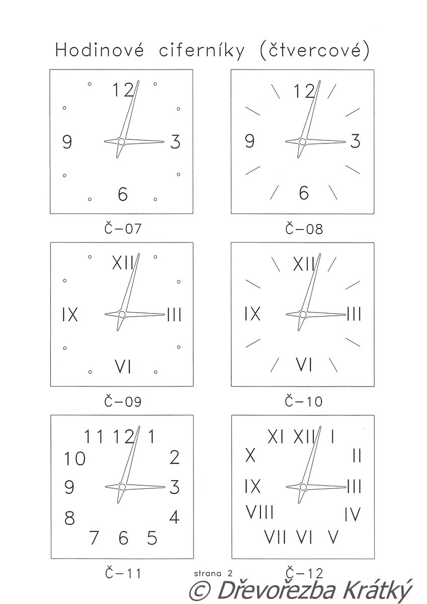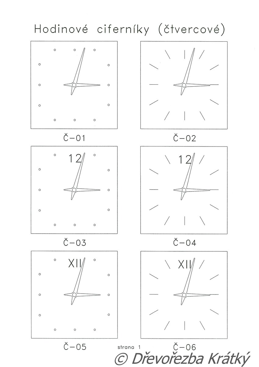 Hodinové ciferníky jsou ve variantách čtvercové a kulaté. Při objednávce uvádějte prosím název ciferníku (např.: Č-01 nebo K-01).